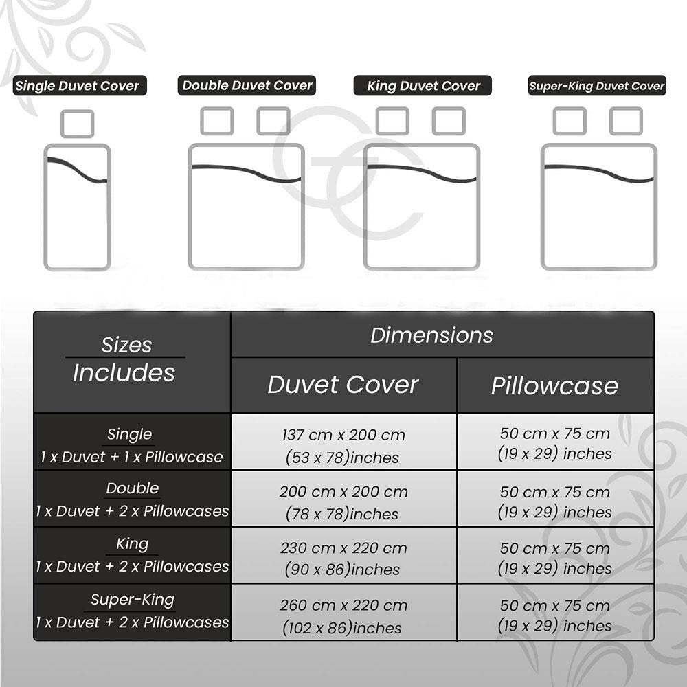 Includes duvet cover and matching pillowcase(s) (single 1x pillow case, all other sizes 2x)